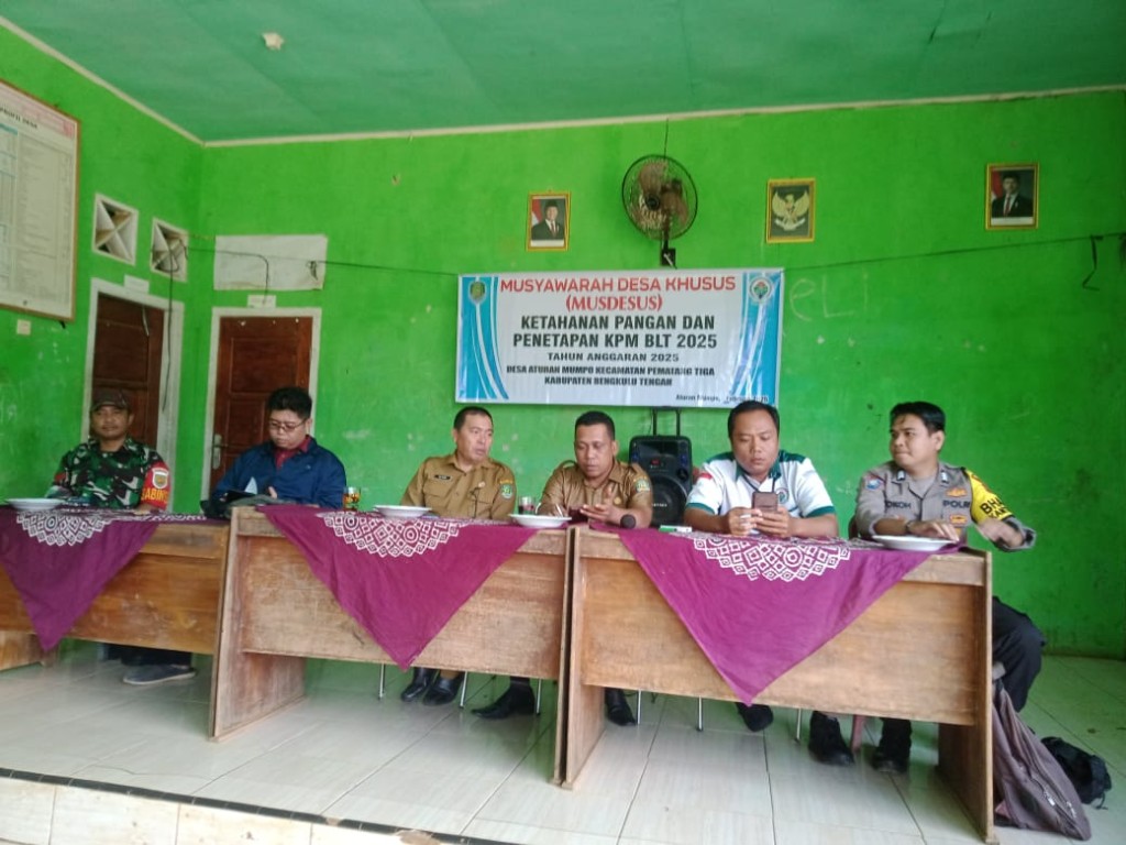 Pematang Tiga, 24 Februari 2025- Musyawarah Desa Khusus (Musdesus) yang membahas ketahanan pangan dan penetapan KPM BLT Tahun 2025 telah dilaksanakan di Desa Aturan Mumpo Kec. Pematang Tiga. Kegiatan Musdesus dihadiri oleh berbagai pihak, termasuk Camat Pematang Tiga, Kepala Desa Aturan Mumpo, Perangkat Desa dan BPD Aturan Mumpo, Perwakilan Gapoktan Aturan Mumpo, Pendamping Desa, Bhabinkamtibmas Polsek Pondok Kelapa, Babinsa Koramil Pondok Kelapa dan berbagai lapisan masyarakat. Dalam forum ini, dibahas berbagai kegiatan terkait program ketahanan pangan dan sekaligus juga penetapan KPM BLT Tahun Anggaran 2025.